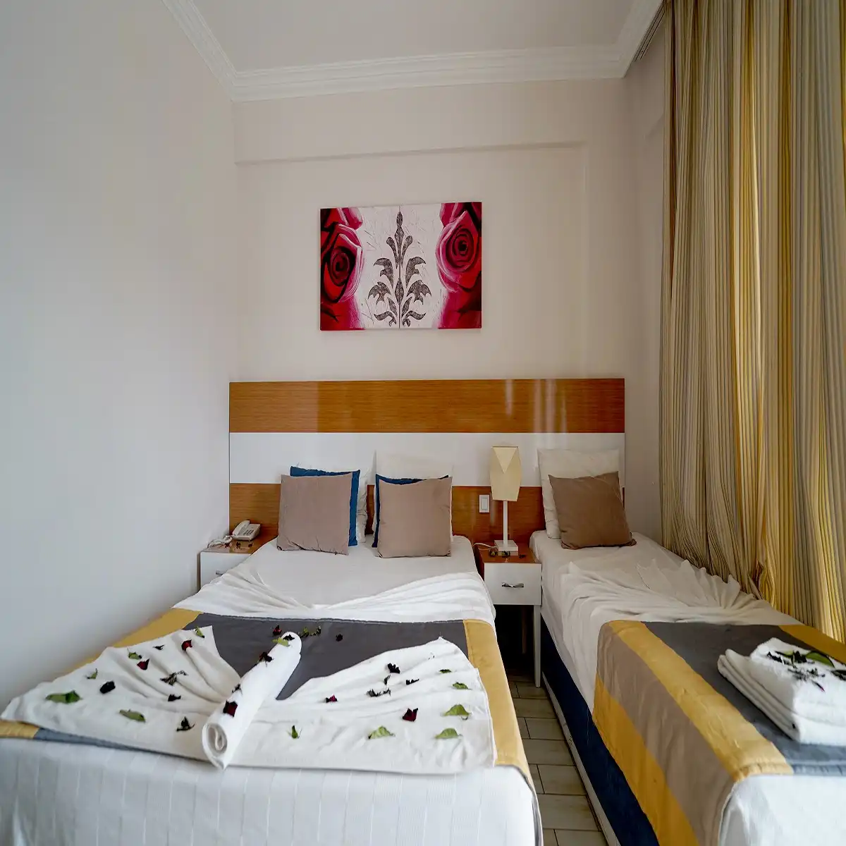 Ana Binada yer alan havuz manzaralı özel tasarıma sahip balkonlu odalarda 1 adet 2 kişilik yatak ya da 2 adet tek kişilik yatak WC, küvetli banyo yer alır.